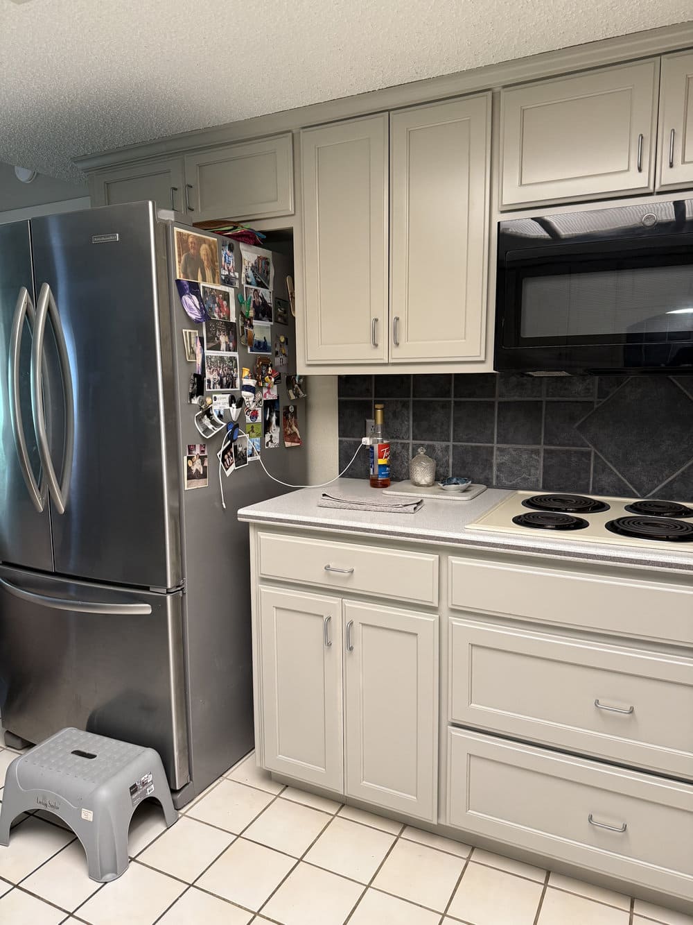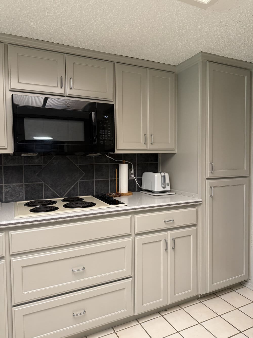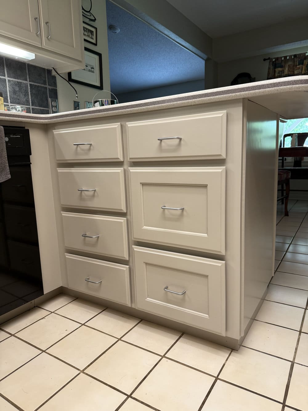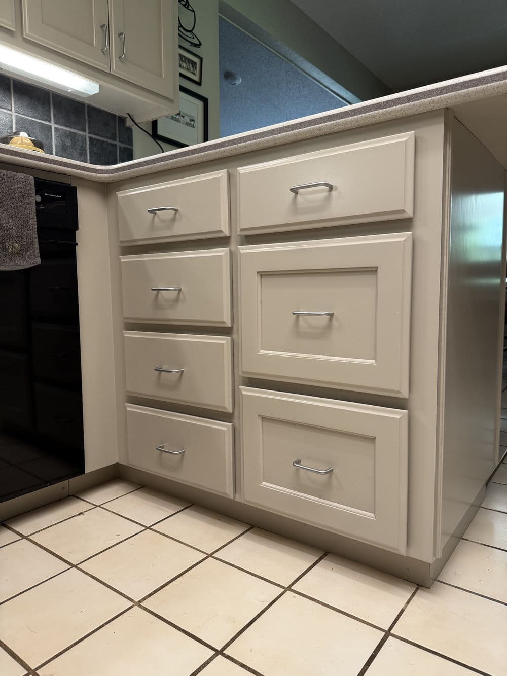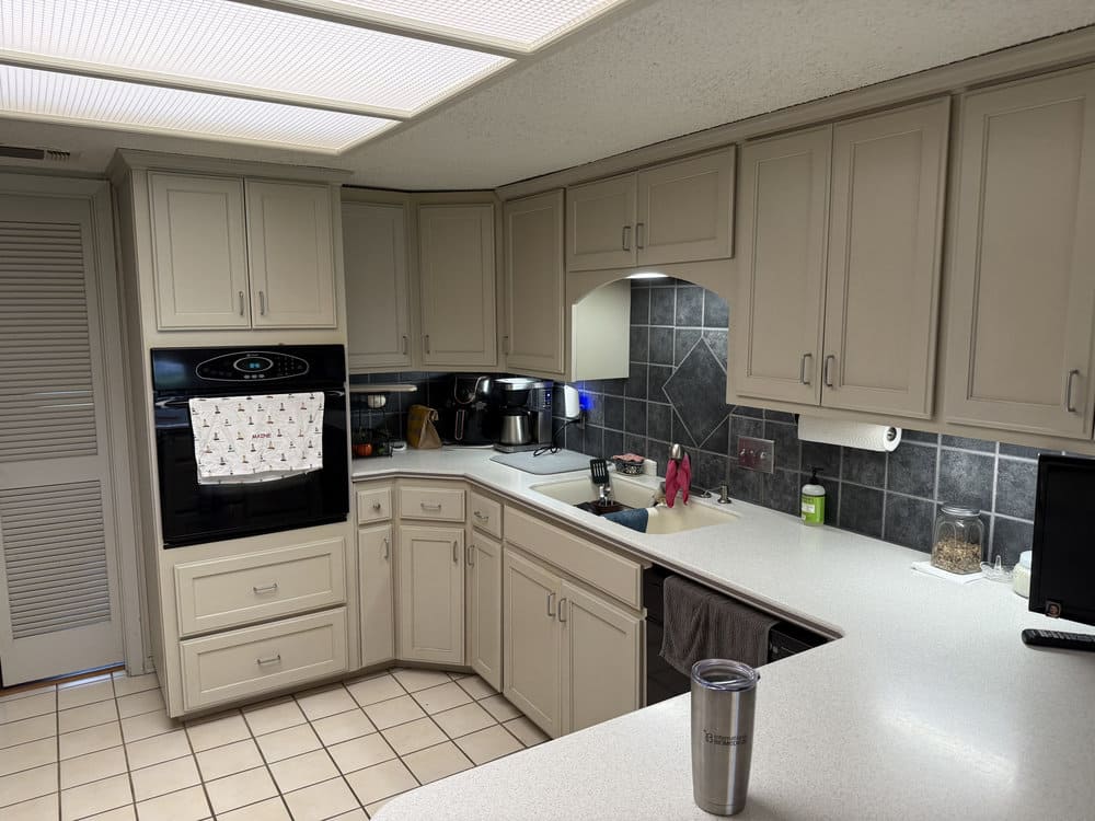We painted the existing kitchen cabinets in a soft, light color that instantly brightened the space and gave it a more upscale appearance. The process included thorough surface prep, gap-filling, priming, and professional spray application for a smooth, elegant finish.